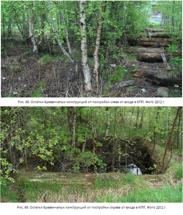 В связи с этим бараки КПП служили общежитиями для рабочих, хозпостройки находились в эксплуатации как завода, так и поселка Рабочеостровск. Сразу после войны часть зданий и сооружений КПП была разобрана. На южной оконечности острова военнопленными была выстроена новая улица жилых двухэтажных домов для рабочих. Затем оставшиеся постройки бывшего КПП были снесены. В настоящее время сохранились только основания двух бревенчатых построек от огромного Кемского пересыльно-распределительного пункта (рис. 68, 69).