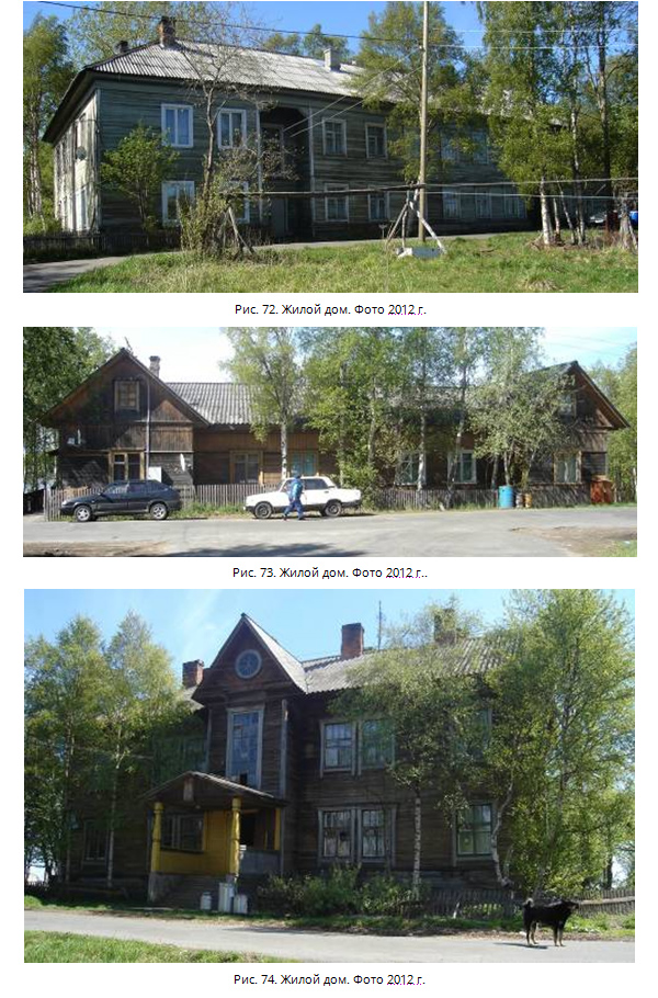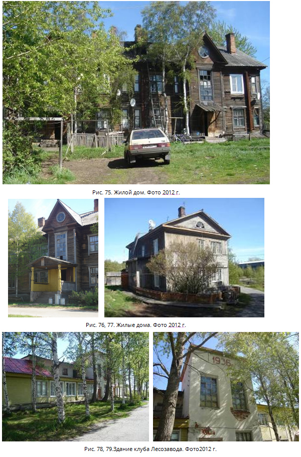 Все постройки в настоящий момент используются под жилье. Своеобразен и по-своему примечателен архитектурный стиль зданий того времени (рис. 72-77) – результат работы Конструкторского бюро УСЛОН, в котором работали Соловецкие заключенные Особый интерес представляет здание заводского клуба, постройка 1936 г. (рис. 78, 79).