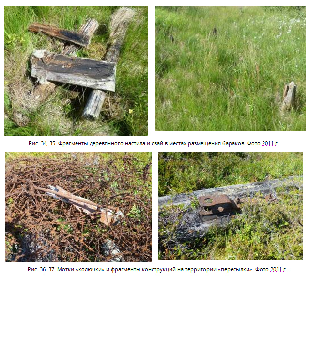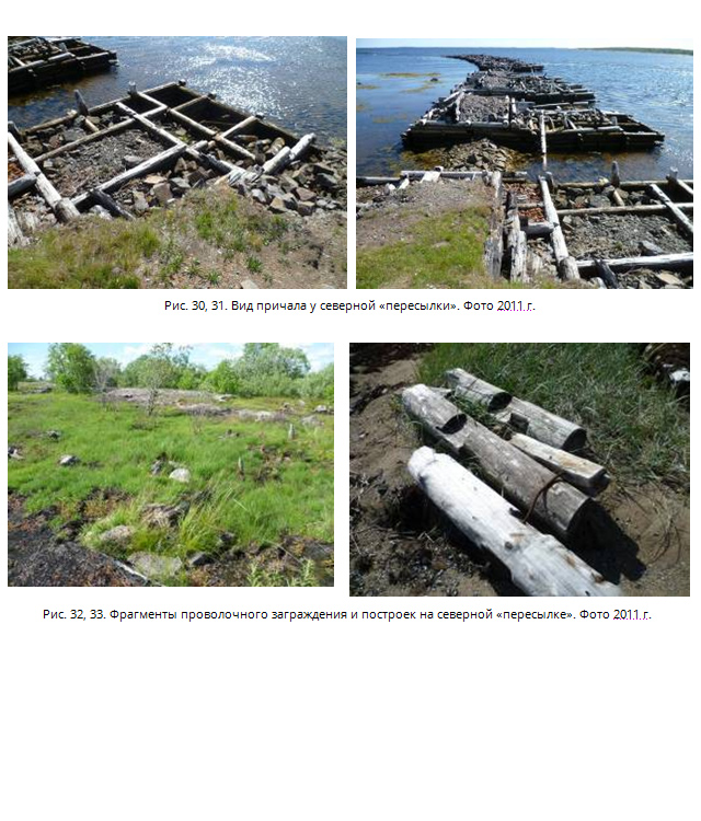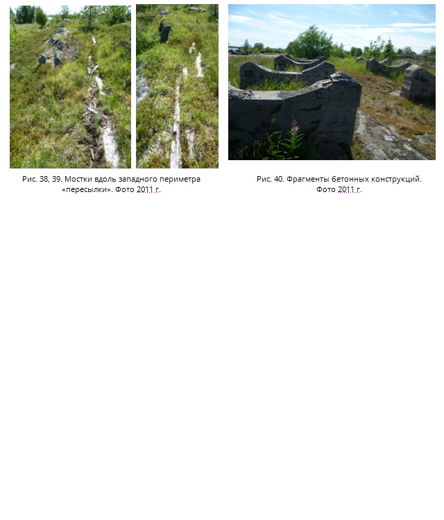 «Пересылка» к северу от Лесозавода практически не сохранилась. В настоящее время местами ещё прослеживается линия железнодорожной ветки от начала дамбы до северного причала (рис. 25-31). Она сохранилась частично, т.к. за последние 5-6 лет велись работы по её демонтажу. Сама «Пересылка» ещё угадывается наружным контуром внешнего ограждения (рис. 32, 33). Постройки на территории не сохранились (рис. 34). В северо-восточном её углу и по западному контуру сохранились элементы столбов с проволокой-«колючкой» (рис. 36-40). В болотистой низинке, в восточной части территории, еще можно увидеть остатки деревянных свай от построек (рис. 35), в юго-западной части – заросшие дерном и кустарником остатки фундаментов. Сохранились дощатые дорожки для прохода охраны вдоль западного контура проволочного ограждения (рис. 38, 39). В 1950-1960-е гг. здесь размещались военные склады, что и послужило поводом для сноса «пересылки». В настоящее время от складов сохранились лишь фрагменты бетонных конструкций (рис. 40).
