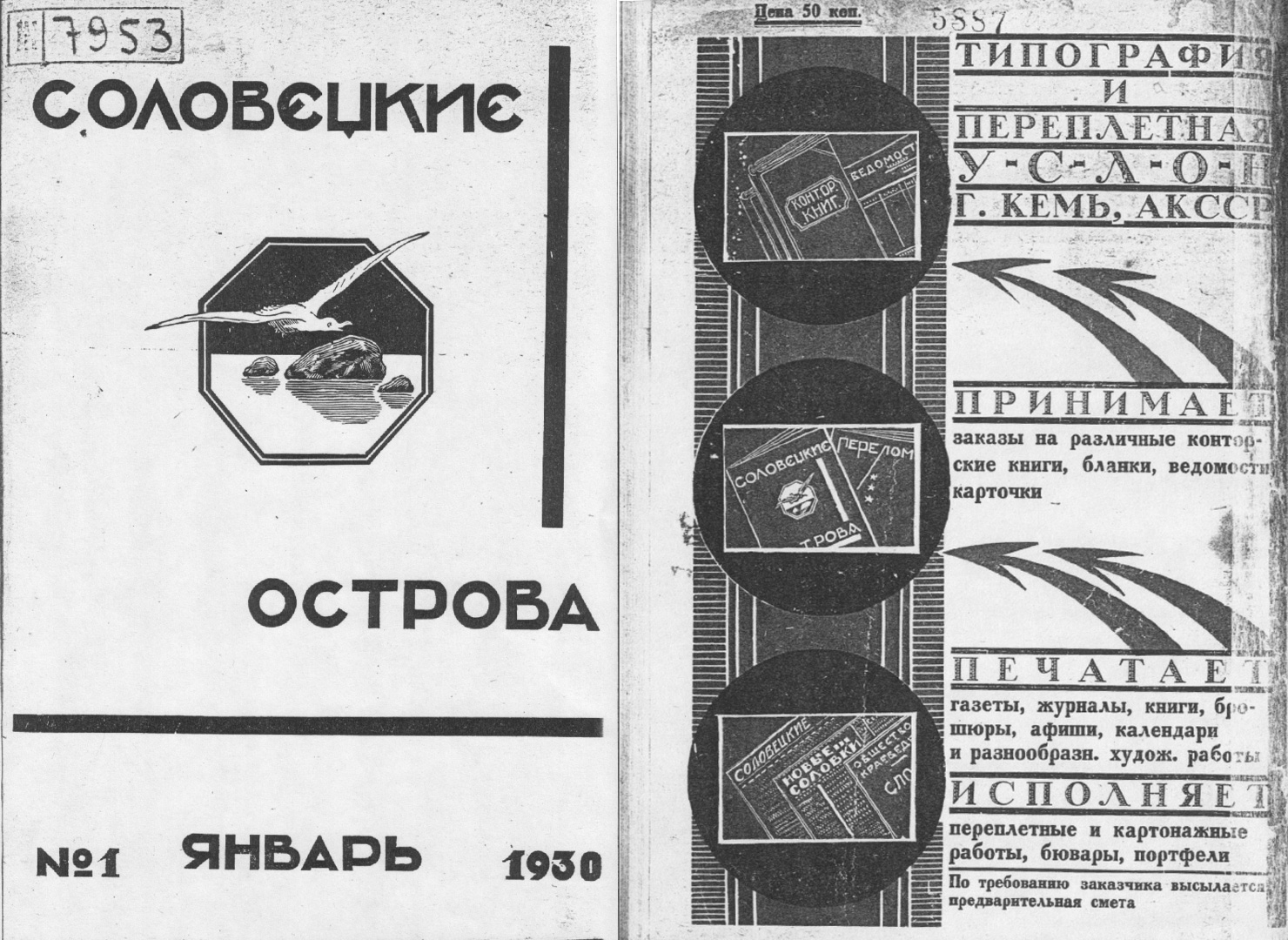 "Эмблемой журнала "Соловецкие острова" в З0-е годы было изображение беломорской большеклювой чайки, летящей над морем на фоне трех прибрежных камней. Только "летела" чайка (в отличие от мхатовской) слева направо." (А.Белоконь. Под соловецким зановесом. "Литературная Россия", 1354. Москва, 13.01.1989)