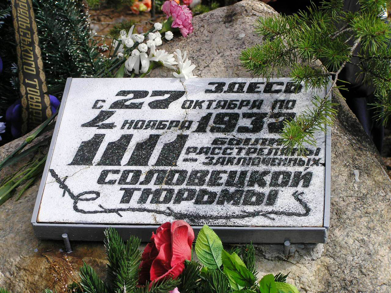 "На месте захоронения расстрелянных осенью 1937 г. советских политзаключенных, предполагается возвести в год 70-летия этой даты памятный мемориал. Об этом сообщил вчера представитель администрации Медвежьегорска. По его словам, приблизительно в 19 километрах к северу от Медвежьегорска с 27 октября по 4 ноября в 1937 г. были расстреляны узники Соловецкого лагеря особого назначения. Сейчас известны фамилии большинства расстрелянных. Среди них четверо православных и один католический епископ, основатель удмуртской национальной литературы Кузибай Гердт, группа удмуртских просветителей, театральный режиссер с Украины Лесь Курбас, академик Рудницкий, министр финансов Украины Михаил Полоз, большая группа политических деятелей Белоруссии и Татарии. Все они были осуждены по 58-й статье за "антисоветскую деятельность" в конце 20-х и начале 30-х годов." ( Независимая газета, Москва, 08.07.1997)