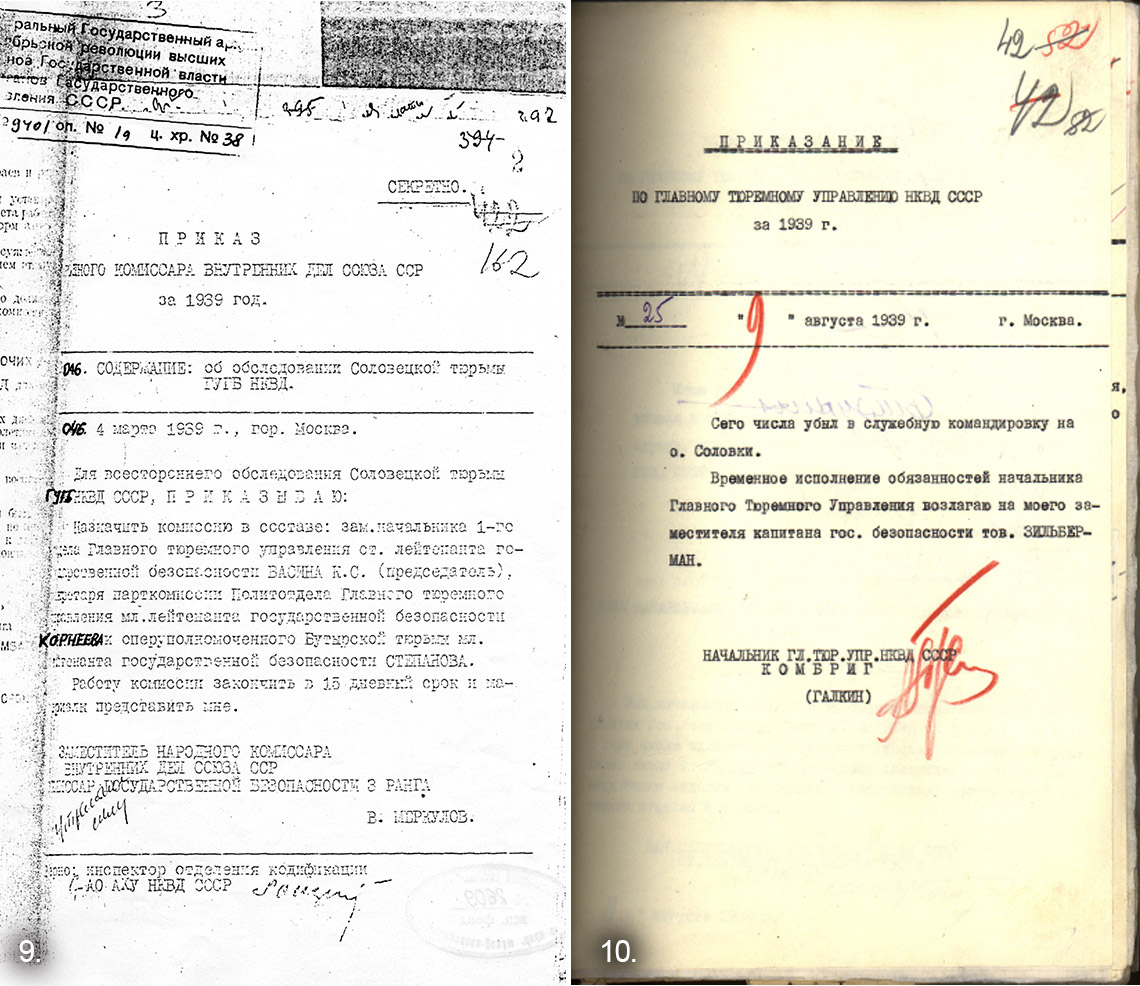 Более подробно о строительных работах вспоминает Илларион Сергеевич Сибиряк – очевидец и участник тех событий. Его тюремный режим «перешел» в лагерный весной 1939 г. В своих мемуарах он затрагивает еще один аспект закрытия тюрьмы – как следствия в результате окончания «Большого террора»: нехватка рабочих рук лагерного контингента на ведущих стройках страны. «…Решением высшей инстанции тюремное заключение для нас летом 1939 г. заменено содержанием в ИТЛ. В Соловецкой тюрьме я пробыл год. В апреле месяце 1939 года, нас заключенных тюрьмы в количестве более 5000 человек пропустили через медицинскую комиссию Норильского ИТЛ под руководством начальника УРО Норильлага Еремеева и врачей Смирнова и Скачкова. Но нас, прежде чем погрузить на пароходы и везти в Норильск Ледовитым океаном решили немного подкрепить, закалить и более, того приучить к порядкам лагерного труда. … Нас, почти всех поселили в те же камеры, но изменили строгий режим содержания. …Мы свободно разговаривали, пели, ходили в туалет по коридору, двери камер были открыты. Сами ходили за пищей, выделяли дежурных на кухню в помощь поварам и кухонным работникам на чистку картошки, рыбы и другие работы. …Во время трудовой закалки на площадке строительства аэродрома, с нами провел митинг-беседу нач. Дудинского порта и отд. ИТЛ, будущий директор комбината А.А.Панюков» [92] Администрация тюрьмы готовила «разгрузку» переводом значительной части тюремного контингента в лагерь. В это время на основании Приказа НКВД СССР № 0046 от 04.03.1939 г. (Ил. № 9) из Москвы прибыла комиссия по обследованию Соловецкой тюрьмы [93], а в апреле – специальная комиссия по отбору особо-опасных Государственных преступников, которые подлежат содержанию только в тюрьмах ГУГБ – Приказание по Главному Тюремному Управлению № 14 от 11.05.39 г. [94] Соловецкая тюрьма ГУГБ готовила «разгрузку», но не для всех. Предстоящие события – «разгрузка», а таким образом и постепенный вывод тюрьмы – сложные операции, которые основывались на Приказах и Распоряжениях из Центра. Это требовало срочной и надежной связи острова с материком. В связи с этим уже 13 мая этого года был издан Приказ № 00521, подписанный В. Меркуловым «о сформировании Соловецкого отдельного гидро-авиазвена Главного тюремного управления НКВД СССР для обеспечения оперативной связи Соловецкой тюрьмы ГУГБ НКВД с материком.» [95] При этом в приказе четко указано, что «командир Соловецкого отдельного гидро-авиазвена ГТУ НКВД СССР в оперативном отношении подчиняется начальнику Соловецкой тюрьмы, но во всех остальных отношениях – Главному тюремному управлению НКВД СССР». Такой шаг ГТУ НКВД СССР предприняло для срочной и секретной связи Соловецкой тюрьмы только с тюремным ведомством, не касаясь вопросов по заключенным лагерного контингента.
