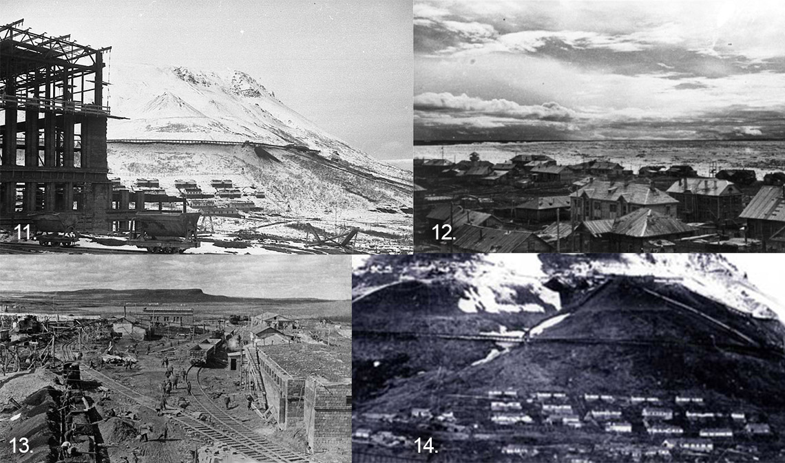 … Вот и Дудинка, ворота Норильска. (Ил. № 12) В Дудинском порту тогда еще не было причалов оборудованных для швартовки речных пароходов, а о морских и океанских нечего было и говорить. Утром 14.08.1939 г. Наш Семен Буденный встал на рейд, мощными гудками известив Дудинку о своем прибытии и нас «бубновотузовых». Так прозвали в Норильске Соловчан, за нашу тюремную форму. На берег перебирались на баржах, буксируемых катерами. На переброску людей с рейда парохода на берег прошел почти весь день. На голом и пустынном берегу Енисея, нас встретил зам. директора комбината Елян, с группой работников лагеря и охраной. …Внимание всех лагерников привлекалось нашей особой и довольно таки странной формой Соловецкой тюрьмы, но разговаривать и общаться пока нам ни с кем не разрешали. …В августе 1939 года наш этап прибывший из Соловецкой тюрьмы был не первым этапом этого лета. Наши лагерные номера, по крайней мере, мой номер по Норильскому ИТЛ был на первых сотнях 21 тысячи.» [107] (Ил. № 13, 14, 15)
