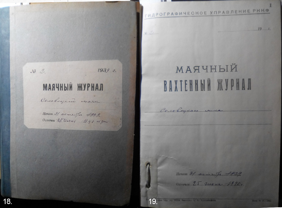 Из доступных архивных документов известно не много. 09 октября 1939 г. начальником ГТУ комбригом А.Г. Галкиным было подписано Приказание об упорядочении хранения планов тюрем с указанием архивов отделений и отделов ГТУ. [109] 17 октября 1939 г. им же подписано Приказание № 37 о составлении предварительного ликвида-ционного плана Соловецкой тюрьмы ГУГБ НКВД СССР, для чего была назначена комиссия. На эту работу комиссии отводилось два дня, а на утверждение этот план ликвидации должен быть представлен «к 10-00 час. 20-го октября с/г.» [110] Допускаем, что этот план ликвидации мог прорабатывать несколько дней со всеми дополнениями и доработками. Но уже 29 октября 1939 г. в ЦК ВКП(б) на имя А.А. Жданова от наркома ВМФ Н.Г. Кузнецова поступило письмо – ходатайство о передаче Соловецких островов Северному флоту в связи с ликвидацией тюрьмы НКВД. [111] Только 2 ноября 1939 г. Лаврентием Павловичем Берией, Наркомом внутренних дел СССР, был подписан Приказ НКВД СССР № 001335 о закрытии тюрьмы ГУГБ на Соловецких островах, а уже 3 ноября 1939 г. Наркомом ВМФ Н.Г. Кузнецовым был подписан Приказ № 455 от 03.11.39 г. о назначении комиссии по приемке Соловецких лагерей НКВД от НКВД. Но только 15 ноября 1939 за подписью В. Молотова вышло Постановление СНК СССР № 1953-539сс о разрешении закрыть с 1 декабря 1939 г. Соловецкую тюрьму с переводом заключенных в другие тюрьмы. [112] Практически только с этой даты – 15 ноября 1939 г. должны были начать вывод тюрьмы с Соловков и приемку-передачу от НКВД СССР в распоряжение ВМФ, т.к. все значимые действия наркоматов должны быть узаконены постановления СНК. О полной «разгрузке» тюрьмы с августа тоже говорить ошибочно, т.к. по данным ГТУ после этапа в Норильский ИТЛ численность только заключенных тюрьмы на 15 августа составила 1071 чел., а уже на 15 октября – 2254 чел., на 1 ноября – 1522 чел. [113] В Москве вопрос о выводе тюрьмы с Соловков был практически решен, а при этом заключенные продолжали поступать на тюремный режим. Фактически, окончательный вывоз тюремных заключенных с Соловков приходится на конец октября – ноябрь 1939 г. Это подтверждают и записи в Маячном журнале № 2 от 1939 г. Гидрографического управления РККФ. (Ил. № 18, 19) Этот журнал Соловецкого маяка был начат 31 октября 1939 г. и окончен 25 июня 1940 г. К сожалению, в Соловецкой Гидрографической службе журналы Соловецкого маяка за 1937 г., 1938 г. и почти весь 1939 г. были изъяты ведомственными структурами ещё в советское время. Но даже из записей этого журнала можно проследить последние этапы вывода Соловецкой тюрьмы и приход на острова ВМФ. А если учитывать, что вывоз морем тюремного контингента и вещевого довольствия тюрьмы – достаточно важный, трудоемкий и длительный процесс, то он должен был сопровождаться участием только тюремной охраны и только на морских судах с командами из штатных тюремных работников. Из записей в Журнале маячной службы можно отследить, что 1, 12, 13, 15, 20, 21, 22, 24 ноября с Соловков в направлении Кеми следовали тюремные корабли «Слон» и «Ударник», при этом 12 ноября пароход шел с баржей, а почти все выходы этих судов из соловецкого порта были в утреннее или дневное время. Надо учесть, что это – ноябрь и в утреннее время 7-00 – 8-00 час. в этих широтах практически ночь.