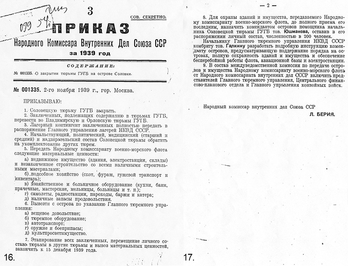 Очень интересный приказ по своему содержанию и срокам. По той ситуации, которая уже сложилась в Соловках, этот Приказ как бы опоздал. И такой момент прослеживается и с другими документами распорядительно-приказного характера в отношении Соловков в этот период. Об этом – позже. Относительно Приказа № 001335, как пример – вывод лагерного контингента в лагеря ГУЛАГа – он уже происходил, т.к. те же Справки о численности свидетельствуют, что на 01.08 – 1722 человека на лагерном режиме, на 15.08 – 1037, на 01.09 – 1049, на 01.10 – 1027, на 15.10 – 1019, на 01.11 – 855. Далее, в отношении этого Приказа о вывозе и передаче – вызывает некоторое удивление: вывезти автотранспорт, а при этом морской, речной и воздушный транспорт передать. Удивление вызывает указание и о вывозе «тюремного оборудования». А вот вывоз «культпро-светимущества» заставляет задуматься. Что имели в виду высшие инстанции, когда составляли текст приказа? Конечно, можно допустить, что это плакаты и лозунги, портреты вождей и книги по истории ВКП(б) – характерный набор предметов в кабинетах и красных уголках. Очень сомнительно, что всему вышеперечисленному администрация тюрьмы, а тем более – руководство ГТУ уделяло столь важное внимание и приказало вывозить при общей эвакуации. Можно высказать предположение – что они имели в виду и красиво обозначили словом «культпросветимущество»: культурные и исторические ценности материального порядка, которые им достались после лагеря на Соловках – ценнейшие предметы из лагерного музея и уникальное собрание книг лагерной библиотеки.