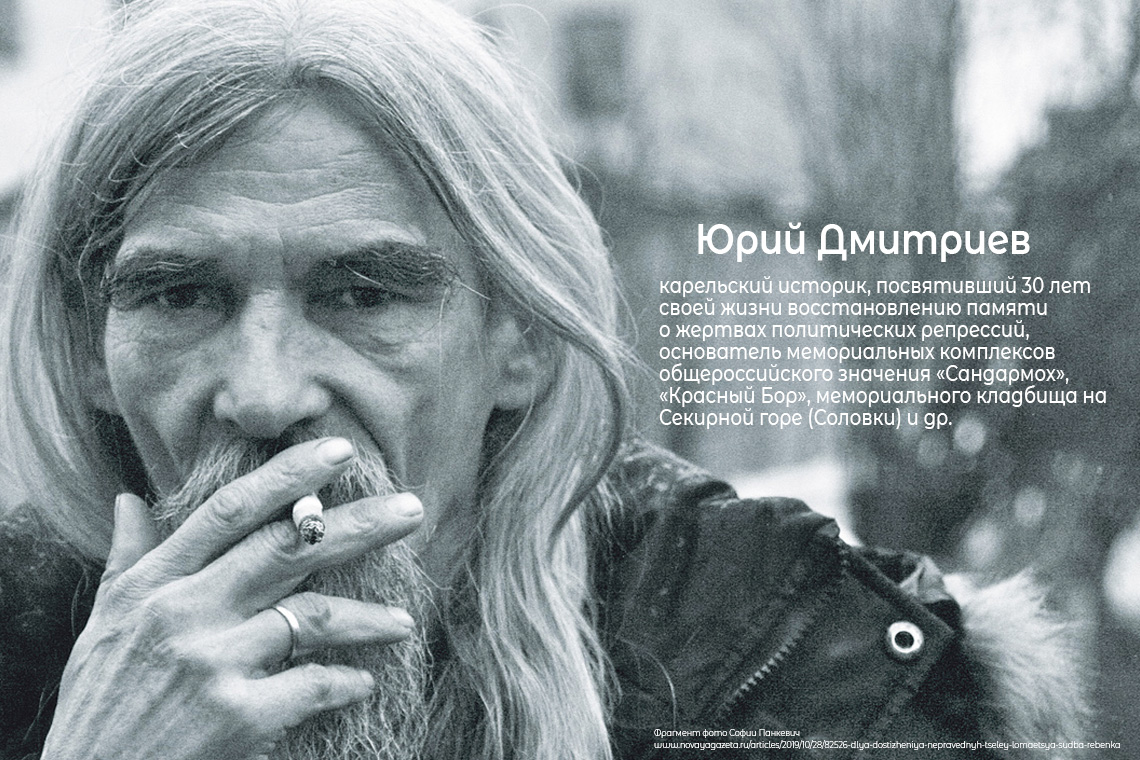 Юрий Алексеевич Дмитриев (1956) — карельский историк-поисковик, посвятивший 30 лет своей жизни восстановлению памяти о жертвах политических репрессий, основатель мемориальных комплексов общероссийского значения «Сандармох», «Красный Бор», мемориального кладбища на Секирной горе (Соловки) и др., составитель книг «Место расстрела Сандармох», «Поминальные списки Карелии», «Беломорско-Балтийский водный путь», «Их помнит Родина», «Красный Бор» и др.