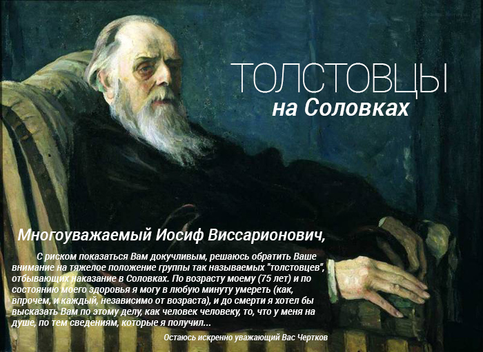 С риском показаться Вам докучливым, решаюсь обратить Ваше внимание на тяжелое положение группы так называемых "толстовцев", отбывающих наказание в Соловках. По возрасту моему (75 лет) и по состоянию моего здоровья я могу в любую минуту умереть (как, впрочем, и каждый, независимо от возраста), и до смерти я хотел бы высказать Вам по этому делу, как человек человеку, то, что у меня на душе, по тем сведениям, которые я получил.