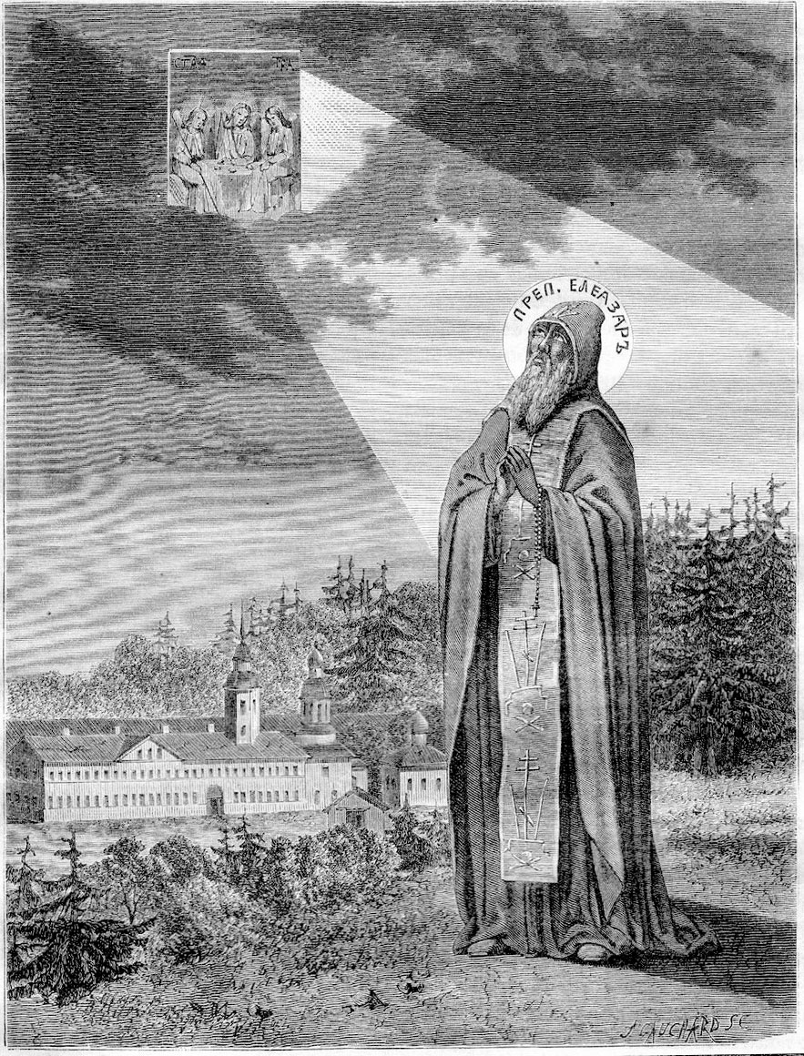 He was born in Kozel'sk to a merchant's family. The male part of his family followed the tradition of withdrawal to the monastery at the end of life. In the monastery Yeleazar showed himself as skillful engraver. At the end of 1614, Yeleazar departed to Anzer Island and settled at the foot of a mountain, which was later named Golgotha. He took up schema and kept to a lifestyle of severe asceticism. He ate only once a week, he bore chains, prayed, read and copied books. After four years, Yeleazar moved to the Trinity Lip of the Anzer Island, where the seafarers since ancient times have found refuge in the foul weather. These seafarers spread the glory about the severe ascetic. People began to come to Yeleazar. Soon a minor-monastery was formed and Yeleazar was elected Father Superior. Conditions of a visit to this minor-monastery were set according to the model of the Athos regulations of divine services: "no names, obedience, silence, patience in grief, fasting and prayer."