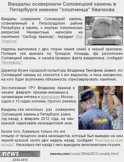 Вандализм во славу палача. Многостра- дальный Памятник жертвам политических репрессий оскверняют регулярно. В очередной раз это произошло в ночь с 21-го на 22 марта. Неизвестные вандалы оставили на Соловецком камне надпись красной краской "Слава Великому Сталину". Прохожие, обнаружившие это утром в субботу, сообщили в милицию. Возбуждено уголовное дело по статье 214 УК РФ (вандализм).(Аргументы и факты, Санкт-Петербург . 26.03.2003)