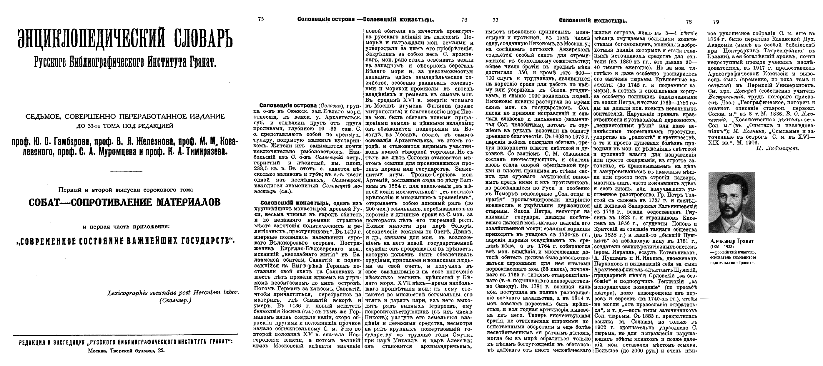 См. арх. Досифей (собственно учитель Воскресенский, труд которого присвоен Дос.) "Географическое, историч. и статист, описание ставроп. первокл. Солов, м." в 3 т. М. 1836; В.О. Ключевский, "Хозяйственная деятельность Сол. м. и (в "Опытах и изследованиях"); М. Колчин, "Ссыльные и заточенные в острог С. м. в XV И — X ИX вв.", М. 1906. " (П.Любомиров. Энциклопедический словарь Русского Библиографического Института Гранат. 7-е совершенно переработанное издание до 33-го тома под ред. проф. Ю.С. Гамбарова, проф. В.Я. Железнова, проф. М. М. Ковалевского, проф. С.А. Муромцева и проф. К.А. Тимирязева. Изд-во "Редакция и экспедиция "Русского Библиографического Института Гранат". Москва. 1924)