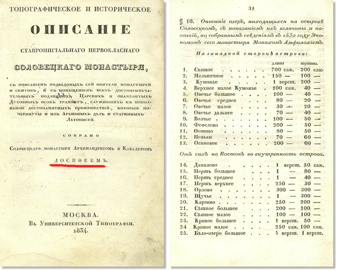 (*) Размеры озер в книге архимандрита Досифея даны в верстах и саженях. В скобках указаны длина и ширина озер в метрах.