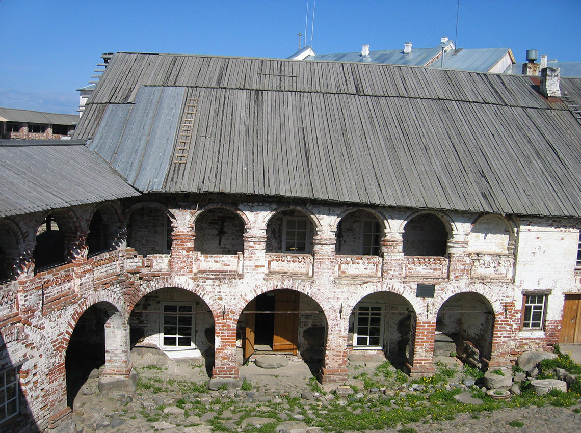 Из особенностей здешних построек обращают внимание подъезды ко вторым этажам сараев, складов и прочих служебных строений. Это — длинные наклонные плоскости, по которым легко вносить или даже подвозить грузы. Такие подъезды — обычны на Севере, но я видел их впервые на Соловках; устройство очень удобное и сохранившееся от монахов. Когда разсматриваешь эти старинные постройки, то бросаются в глаза здешние бревна — закрученные в тугие, с малым ходом, спирали. Постоянные здешние ветры делают это обычное у деревьев приспособление (спиральную тенденцию, придающую стволу пружинность) чрезвычайно ярко выраженной.