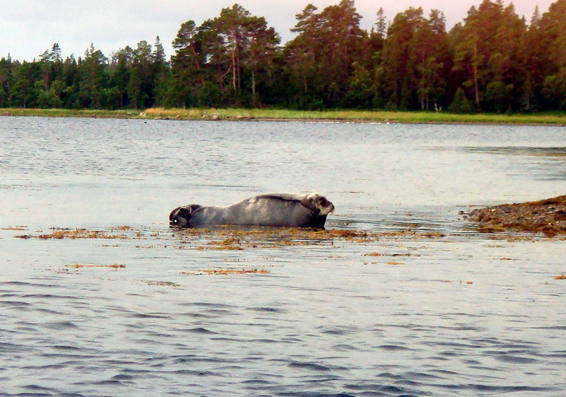 Раньше было много тюленей. Теперь же из ластоногих остались морской заяц и нерпа. Одного такого зайца я видел у нас здесь на выставке. Он был среднего размера, но все же в длину был около 1,5 метра, а бывают и 2 метра. Очень похож на тюленя. Глаза у него круглые, кроткие, совсем человечьи. Ушей нет, есть только ушные отверстия, которые он может затягивать, когда погружается в воду. Ноздри тоже очень странные — затягиваются, как кисет, — это тоже приспособление для ныряния. […] были также две нерпы. Они похожи на зайца, но чернобурые, тогда как заяц серобурый, и значительно меньше его.