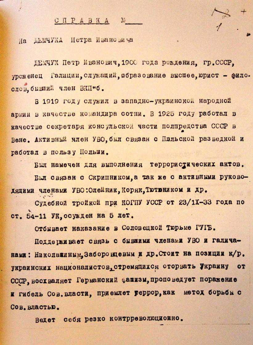 Политзаключенный Соловков украинец Петр Демчук в советском концлагере не боялся подавать, и не раз, голос протеста – видно по всему, был не из пугливых. Когда в январе 1934-го его доставили в исправительно-трудовое учреждение в Лодейном Поле (Свирский лагерь), в учетно-статистическую карточку регистратор вписал основные биографические сведения о заключенном. Среди них такие: командир сотни в народной армии Западной Украины (то есть в Украинской галицкой армии, 1918–1919), а в 1920-м в Красной армии он был комиссаром отряда. Еще раньше, в 15 лет, добровольцем вступил в ряды украинского национального воинского формирования в составе австро-венгерского войска (был в 6-й сотне Украинских сечевых стрельцов Андрея Мельника). Принимал участие в боях, ранен на австрийско-российском фронте и дважды бежал из польского плена.