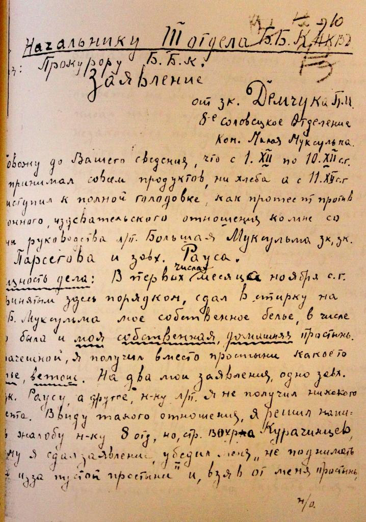Четвертые сутки голодовки были отмечены тем, что заключенный представил заявление на трех страницах начальнику III отдела и его копию – прокурору по надзору за органами ББК НКВС. Борец за права довел до ведома адресатов, что голоданием он протестует против издевательств тамошнего руководства – начальника лагерного пункта Парсегова и завхоза Рауса (они, к слову, тоже были заключенными, только на административных должностях). «Сущность дела, – доходчиво, с подчеркиваниями, вывел чернилами на бумаге профессор Демчук. – В первых числах мес[яца] ноября с. г. я принятым здесь порядком, сдал в стирку на л/п Большая Муксульма мое собственное белье, в числе коего была и моя собственная, домашняя простынь. Из прачечной я получил вместо простыни какое-то тряпье, ветошь. На два мои заявления, одно завх[озу] з/к Раусу, а другое н[ачальни]ку л/п я не получил никакого ответа».
