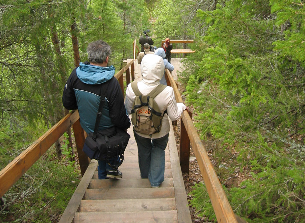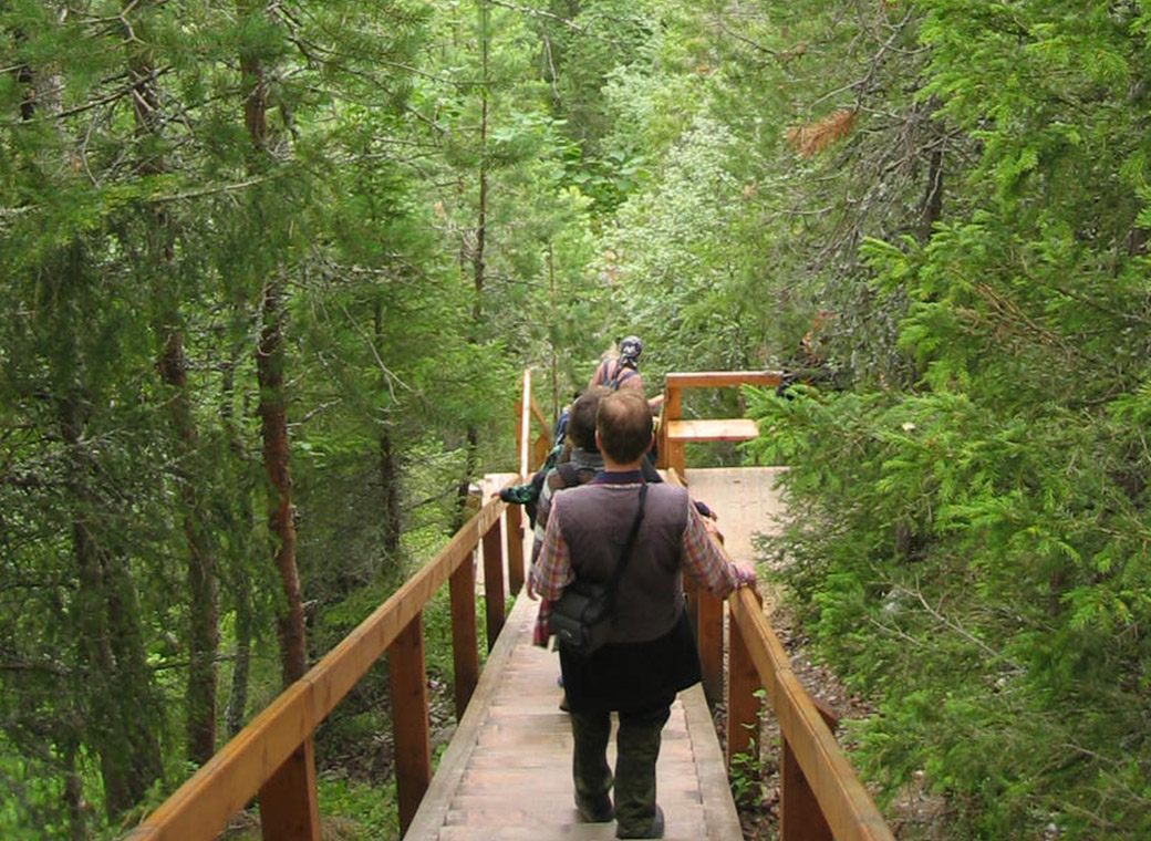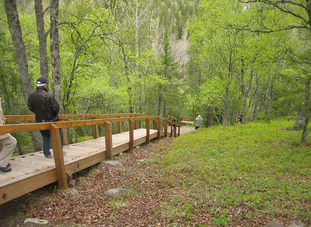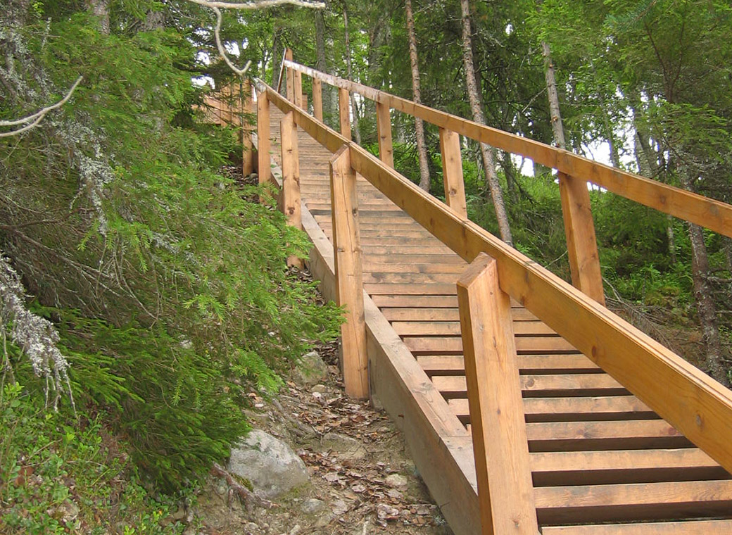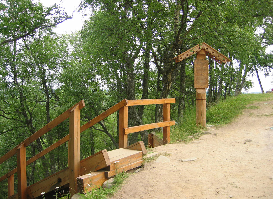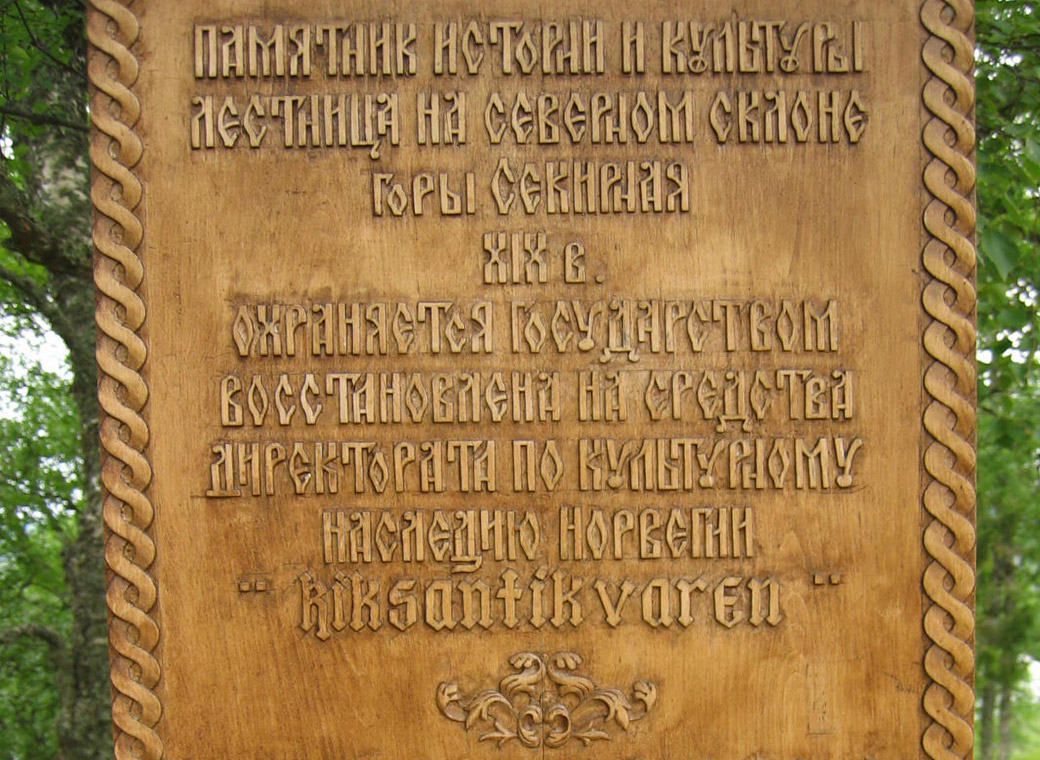 На деревянном щите возле входа на лестницу вырезано (орф. и пункт. сохранена): "Памятник истории и культуры лестница на северном склоне горы Секирная XIX в. Охраняется государством восстановлена на средства директората по культурному наследию Норвегии «Riksantikvaren»"
