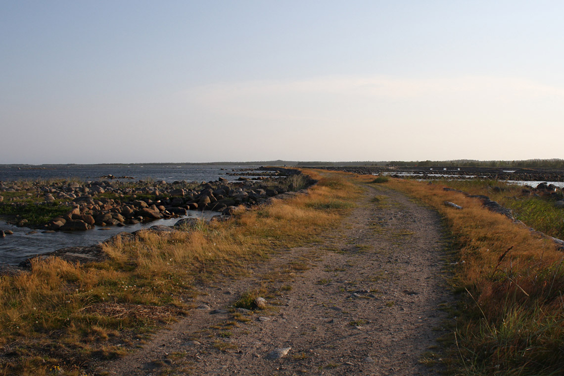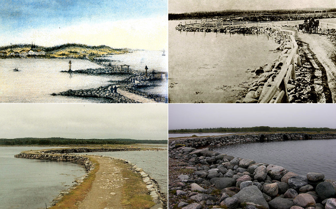 "Для начала краткая историческая справка из книги "Соловецкий Монастырь": "Валунная дамба проложенная между Большим Соловецким островом и Большой Муксалмой в 1865-1871 годах - одна из ярчайших достопримечательностей архипелага. Длина её около километра. По ней перегоняли монастырские стада, тогда как раньше скот от монастыря доставляли на остров с большими сложностями: через бурный пролив "Железные Ворота", на лодках или плотах. Большое количество мелей между островами позволило использовать их как основу для прокладки дамбы. Многочисленные монастырские трудники, руководимые талантливым строителем монахом Феоктистом, меньше всего думали о художественном впечатлении, которое она может произвести на зрителя, и тем не менее, исходя из характера местности и природного материала, они создали на редкость выразительное сооружение".