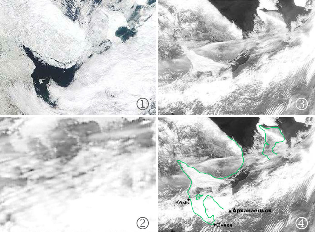 Уникальные снимки ледовой обстановки вокруг Соловков, сделанные американскими учеными NASA со спутников Terra и Aqua в 1999 и 2002 годах.