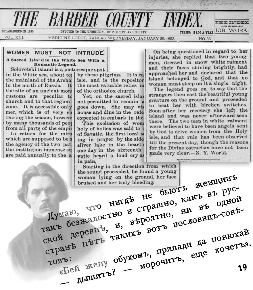 Текст прекрасен деталями! Для жителя североамериканских прерий Соловки - сплошная загадка, вызывающая множество наивных вопросов. Непонятно, зачем гнать женщин со столь прекрасного места? Если остров Святой, то почему женщинам там не место? Почему мужчины бьют женщину, да ещё и вдвоем? Ковбои - парни не подарок, могут и походя пристрелить, но даже для них западло дрынить бабу (простите жаргон Соловецкого лагеря).