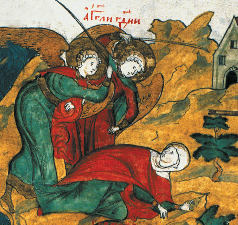 Церковный рассказ о благообразных юношах, жестоко и с гневом бивших мирян по рёбрам железными прутьями на Секирной горе, подразумевает, что цель оправдывает средства, если преступление совершается с благими намерениями, и евангельские заповеди в такой ситуации могут быть легко перечёркнуты. «Женщина с двумя заплетёнными косами стоит на коленях, причём туловище её наклонено вперёд, руки её обращены туда же и книзу, они упираются в землю, одним словом, она находится в положении на четвереньках. Каждый из ангелов со своей стороны одной рукой прижимает женщину к земле рукою за косу, а другой свободной рукой совершает акт наказания», — гласит текст описания миниатюры из шикарной лицевой рукописной книги «Сад Спасения», созданной в 1711 году
