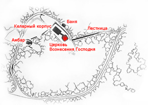 Другие постройки скита. У основания церкви, ранее имевшей ограждение и навес, создана смотровая площадка с видом в северо-восточном направлении. Рядом на Секирной горе к западу от церкви - двухэтажный деревянный дом для монахов и гостей. Дом обшит доской. На центральной оси дома находился фронтон, крытый балкон и трехчастное окно. К северу располагалась конюшн. На склоне горы валунная баня и колодец - типичные сооружения Соловков. Вид построек у высокого здания церкви открываются не сразу - добротные постройки становятся видными только при приближении. Дорожки выложены камнем. От кремля к храму ведет дорога, которая обходит гору внизу и постепенно поднимается вверх. К Секиро-Вознесенскому скиту от основания горы можно подняться по знаменитой деревянной лестнице.