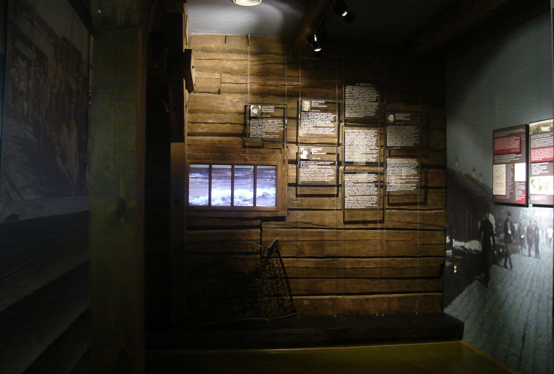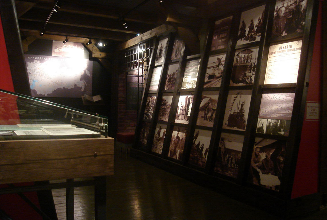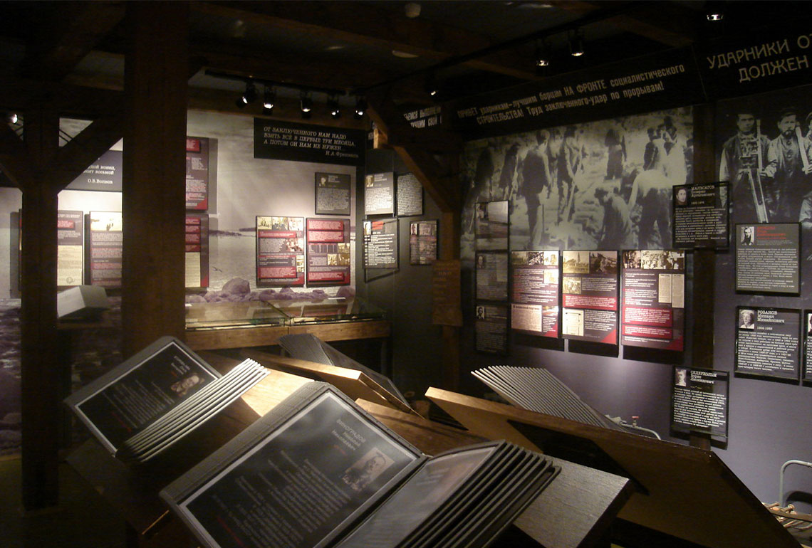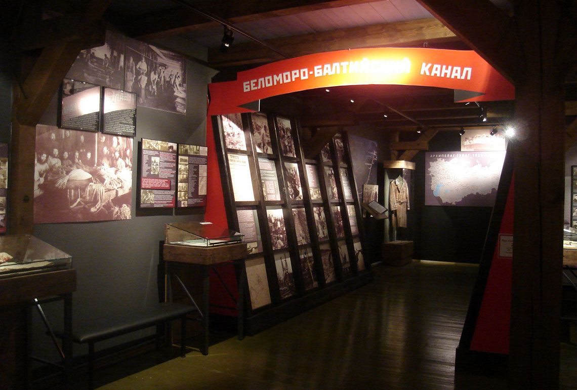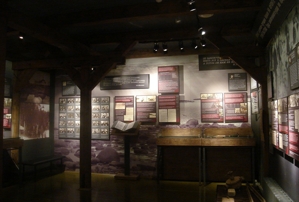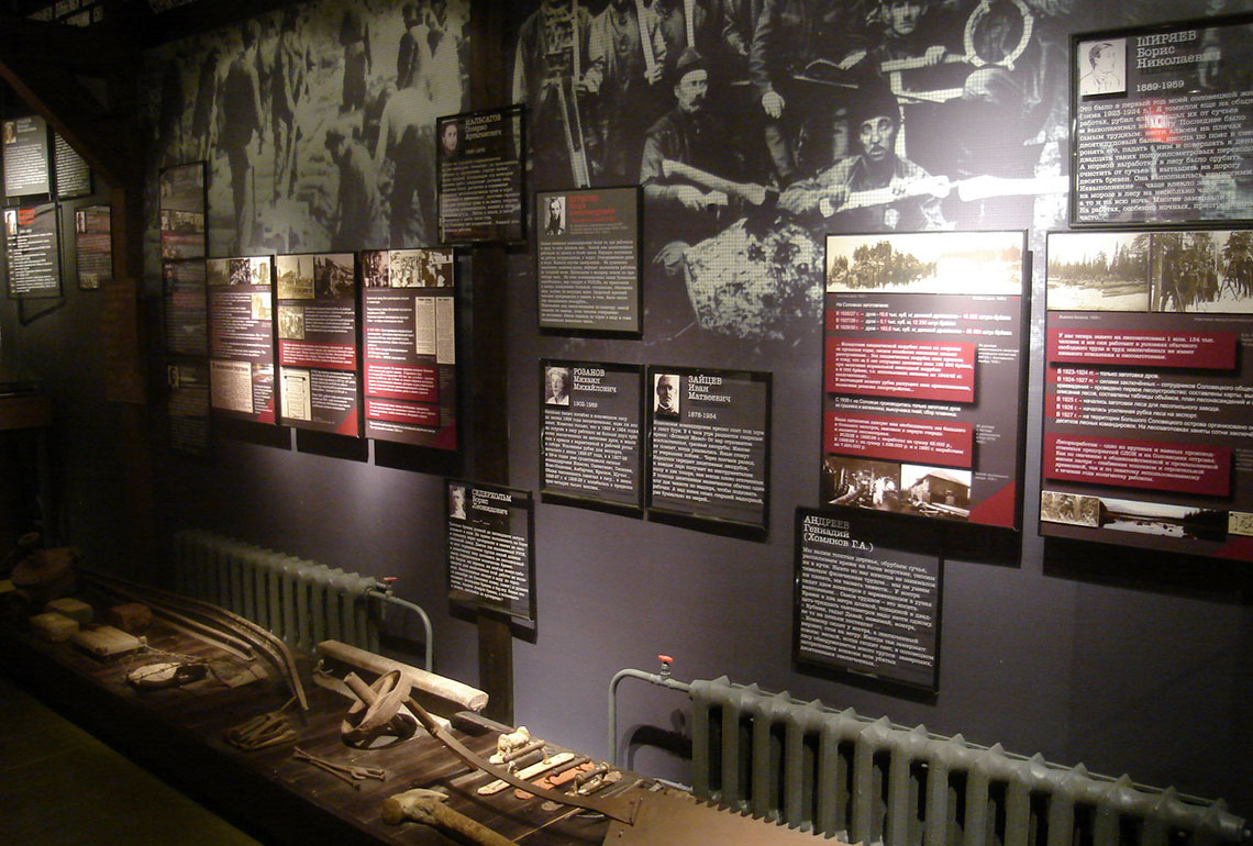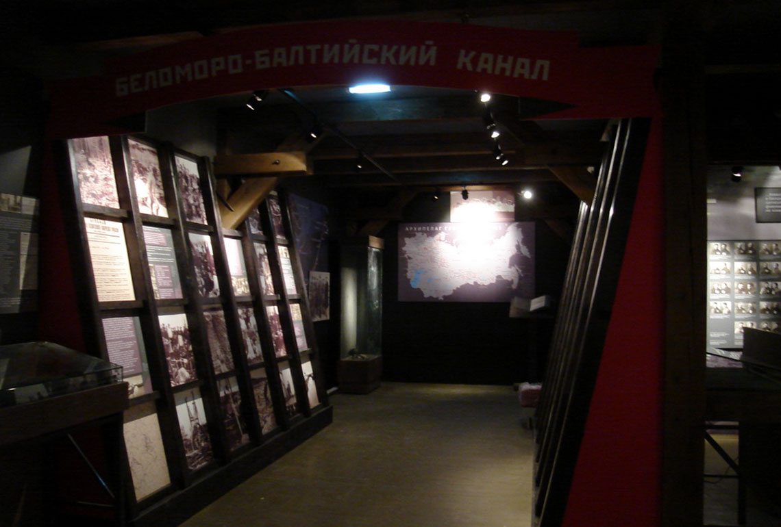 Экспозиция тематически разбита на несколько залов. Например, в зале №5 посетители могут ознакомиться с историей тяжелых видов работ для заключенных: лесоповале, торфоразработках, женском труде на кирпичном заводе, строительстве железной дороги. В зале №6 размещен раздел о жизни соловецких заключенных вне островов. Левая сторона выставки-конструкции посвящена истории Беломорско-Балтийского канала, а правая – Вайгачской экспедиции и экспедиции соловецких зэков на Ухту и Печору.