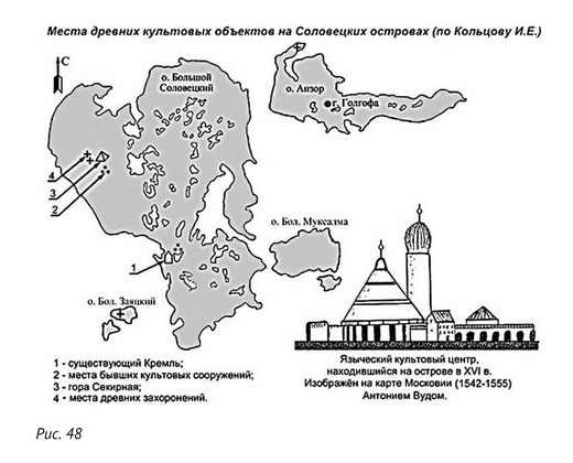 На карте Московии 1542-1555 гг. картографа Антония Вуда на Соловецком острове в миниатюре изображён комплекс каменных культовых сооружений с храмом, который был подобен легендарному храму в Стоунхендже (Англия). На этой же карте подобный храм изображён и в Великом Новгороде. Они были разрушены в XVII в. фанатиками от христианства в борьбе с языческим многобожием. " (Кольцов Иван. Русская Атлантида. К истории древних цивилизаций и народов. Изд. «Алгоритм». 340 стр., 95 илл. 2013. ISBN: 978-5-4438-0122-3)