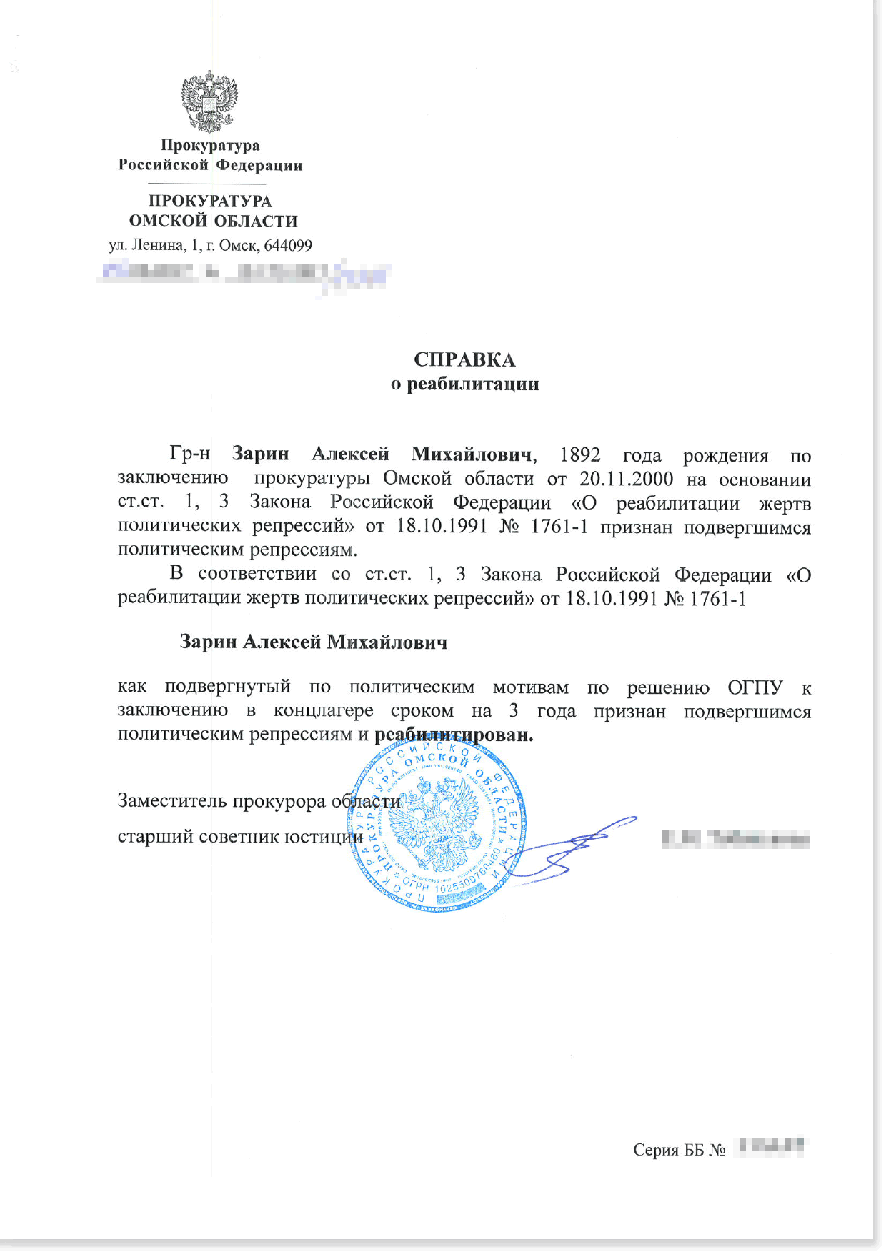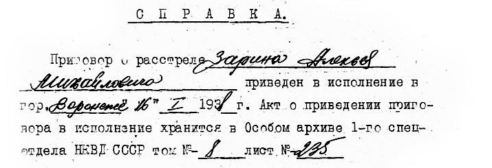 Согласно материалам дела №24892 ГАОПИ Воронежской области за 1931 год, Зарин А.М., проживавший в г.Воронеже, был арестован 15.09.1930 СПО ПП ОГПУ по ЦЧО. Постановлением особого совещания при коллегии ОГПУ от 13.01.1931 осужден по ст.58-10, 58-11 УК РСФСР на 3 года ссылки на Урал.