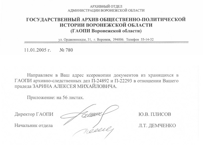 Согласно материалам дела №22293 ГАОПИ Воронежской области за 1937 г, Зарин А.М., проживавший в с.Челек Пай-Арыкского района Узбекской ССР, работавший бухгалтером артели "Баджарамиз", был арестован 01.03.1937 СПО Самаркандского сектора НКВД Узбекской ССР в г.Самарканде. Согласно постановлению СПО Самаркандского сектора НКВД Узбекской ССР от 01.02.1937 Зарин А.М. после ареста подлежал направлению этапом в г. Воронеж в распоряжение УНКВД по Воронежской области. Согласно анкете арестованного (л.д. 9 об), Зарин А.М. поступил в распоряжение УНКВД по Воронежской области 20.03.1937.