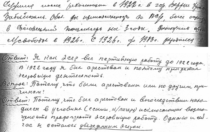 Судился в 1922 в г.Вер[хнеудинске]*... Уфимского [уезда]... Ссылка на Соловки. 1923-24