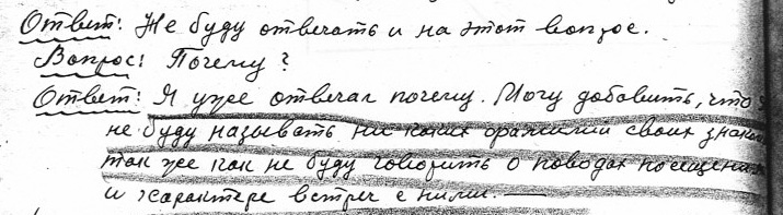 "Я отказываюсь давать показания о связях в Самарканде и на все вопросы связанные с моими товарищами по ссылке и заключению..." "..и сейчас остаюсь убежденным эсером." "Я эсер. Я отношусь враждебно к политике ВКП(б)" "Виновным себя в предъявленном обвинении не признаю. Предъявленные мне материалы следствия, которыми я изобличаюсь как, якобы, участник контр-революционной организации считаю вымышленными. Данные мною показания ранее на следствии от 31 марта и 9 августа подтверждаю."