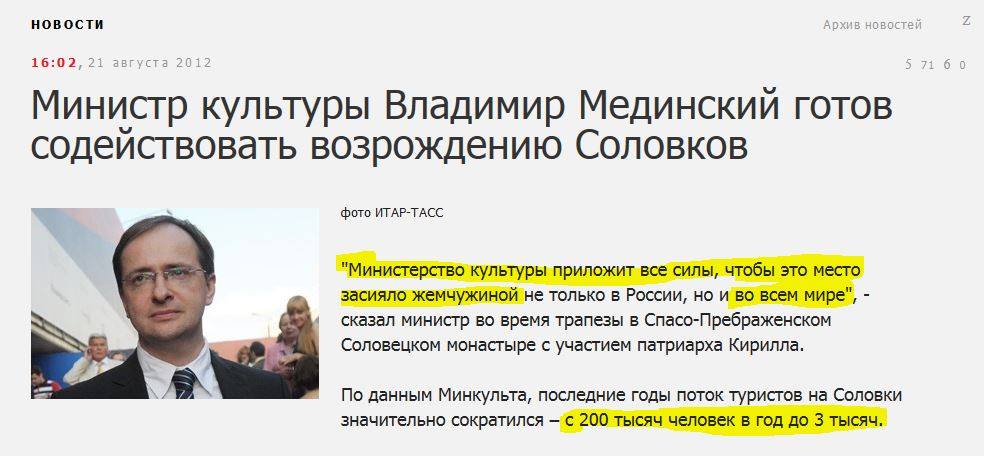 "Не было на русской земле человека, который бы за свою жизнь не побывал и этим местам не поклонился" - цитирует Мединского журнал. Между тем, Соловецкие музей и администрация давно и ежегодно отчитываются о числе туристов, побывавших на Соловках за сезон. Легко подсчитать, что за последние 30 лет 99,7% россиян на Соловках не были и кланяться этим местам не собираются. Увы, но на русской земле тех, кого интересуют Соловки, очень и очень мало. Соловки "фильтруют" избранных... в том числе, увы, и полных идиотов.