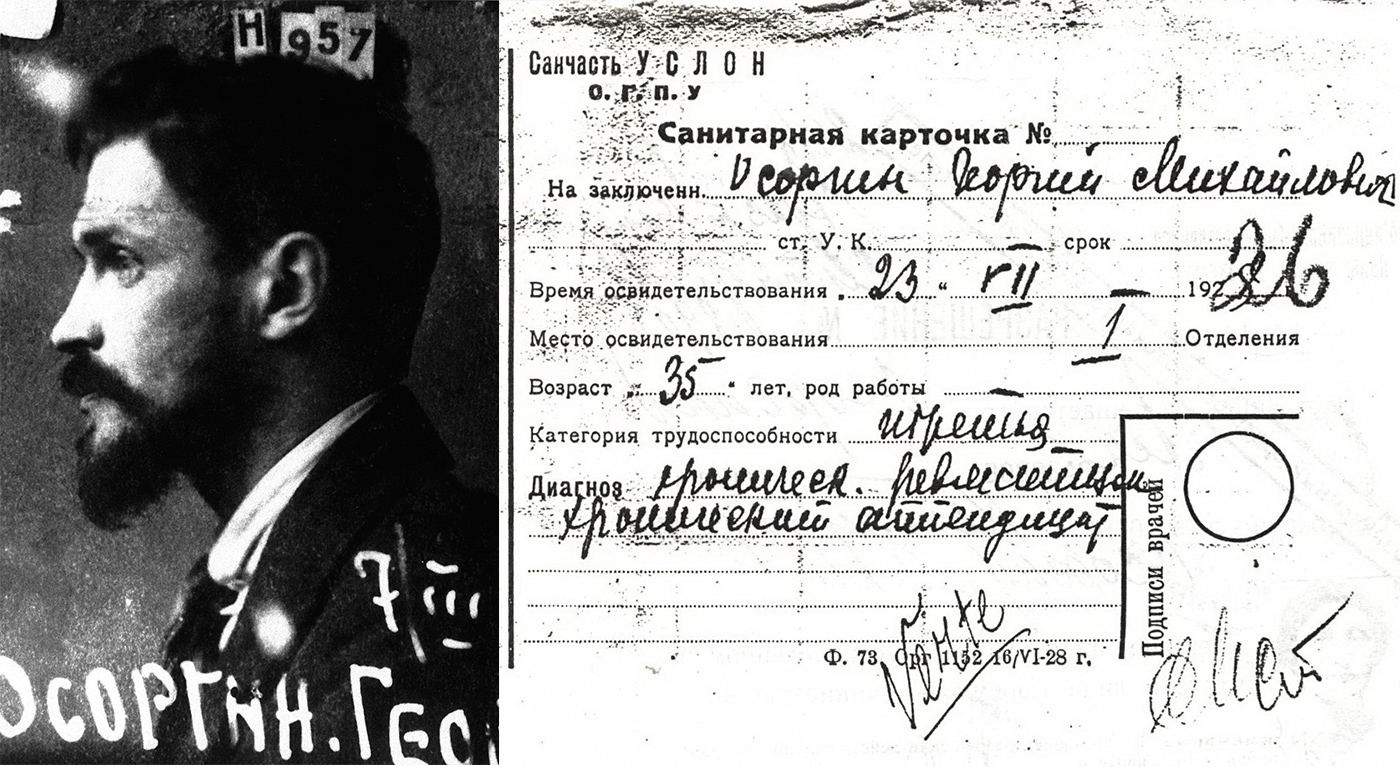 В Регистрационной карточке гражданского заключенного УСЛОН ОГПУ Осоргина Г.М. отмечено, что «поступил из Ленинграда 06.05.1928 г. при документе № 13/393/ от 27.04., ст. 60 и 81, на срок 10 лет с 06.03.25 по 06.03.35.», а в Учетно-регистрационной карточке УСЛОН ОГПУ вписано: «Категория трудоспособности - 2-я на 1 год, основание – санитарная карточка» Санчасти I-го Отделения УСЛОН. Освидетельствование 23 июня 1928 г. определило Осоргину Г.М. уже 3-ю категория трудоспособности, т.к. установлен диагноз – хронический ревматизм, хронический аппендицит. Годы в Бутырской тюрьме дали свои плачевные последствия, но в Соловках сослужили неоценимую услугу – Осоргина оставили работать при лагерном лазарете I-го Отделения.