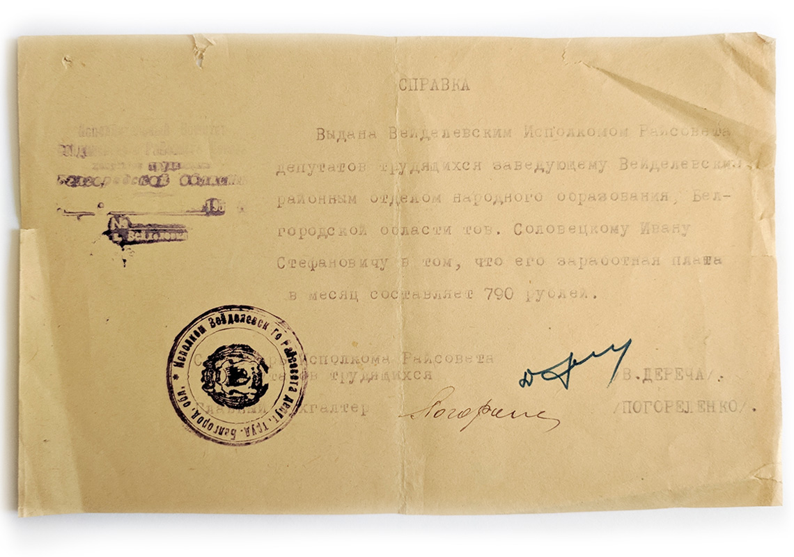 Пожалуй, единственным человеком в жизни Соловецкого, которого он «обидел», оказалась, как это не покажется странным, его супруга Нина Павловна, к слову сказать, тоже с «красным» дипломом окончившая Харьковский учительский институт. Хотя и заслуживала Нина Павловна — умный и чуткий педагог, любящий свое дело и положивший на него в сущности всю свою жизнь, воспитавшая вместе с супругом двоих сыновей, награду она не получила. Иван Стефанович каждый раз без тени сомнения вычеркивал ее из списка представленных к награждению. Считал нескромным награждать родного человека. Да и в обществе бытовало такое же мнение.