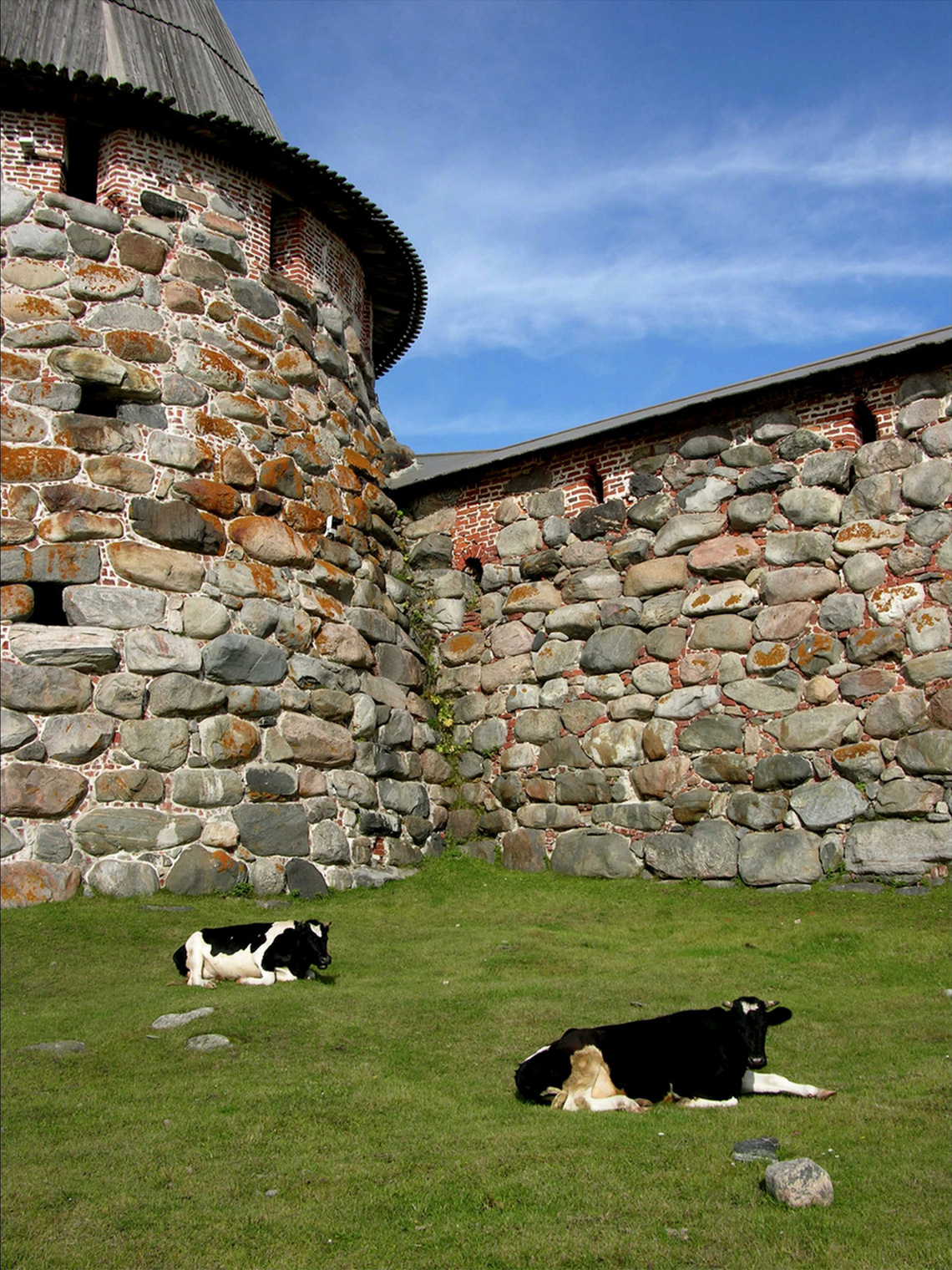 "Вот уж кому живётся на Соловках привольно, так это коровам: питаются они исключительно цветами с венков, которые приносят к памятнику Соловецким юнгам. Днём у коров обязательно тихий час под стенами монастыря. Перед сном - прогулка по берегу моря. А живут коровы - в Преображенской гостинице, это вам не хухры мухры."