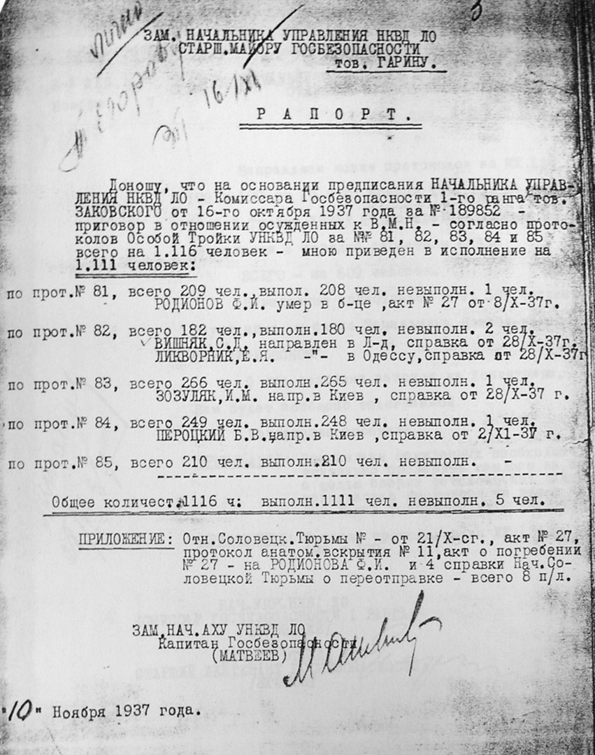 Расстрелы состоялись с 27 октября по 4 ноября. Рапорт об исполнении Матвеев направил Гарину 10 ноября 1937-го. В нем сообщал о расстреле 1111 человек — на 5 человек меньше, чем намечалось. К тому времени один из заключенных умер, а четверо были спецконвоем направлены в Ленинград, Киев и Одессу для проведения следственных действий. Упомянутые в документе этапированные в Одессу Ефим Ликворник и в Киев — Иосиф Зозуляк и Борис Пероцкий не избежали казни и были расстреляны, соответственно, 22, 23 и 26 ноября 1937-го в Одессе и Киеве. Дата расстрела отправленного в Ленинград Самуила Вишняка неизвестна.