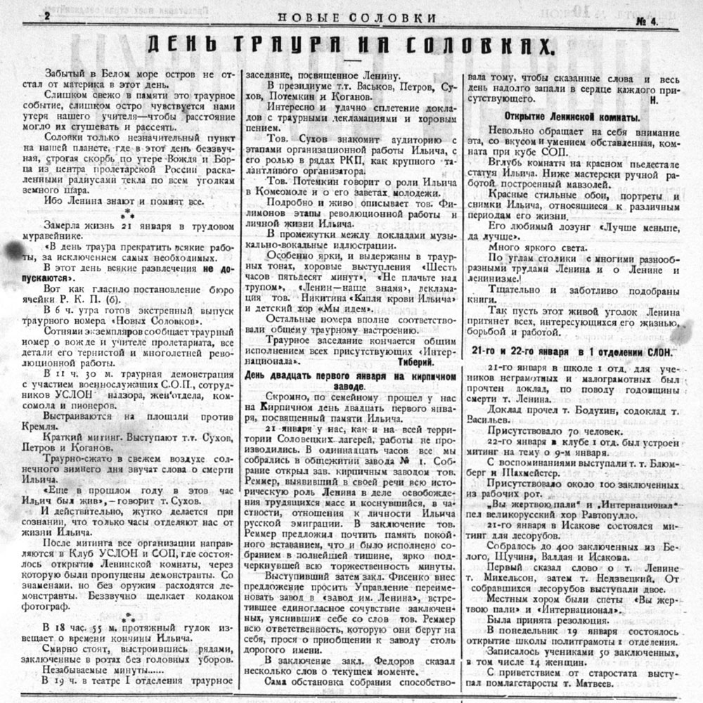 "В день траура прекратить всякие работы, за исключением самых необходимых. В этот день всякие развлечения не допускаются". Вот так гласило постановление бюро ячейки РКП(б). В 6 ч. утра экстренный выпуск траурного номера "Новых Соловков".