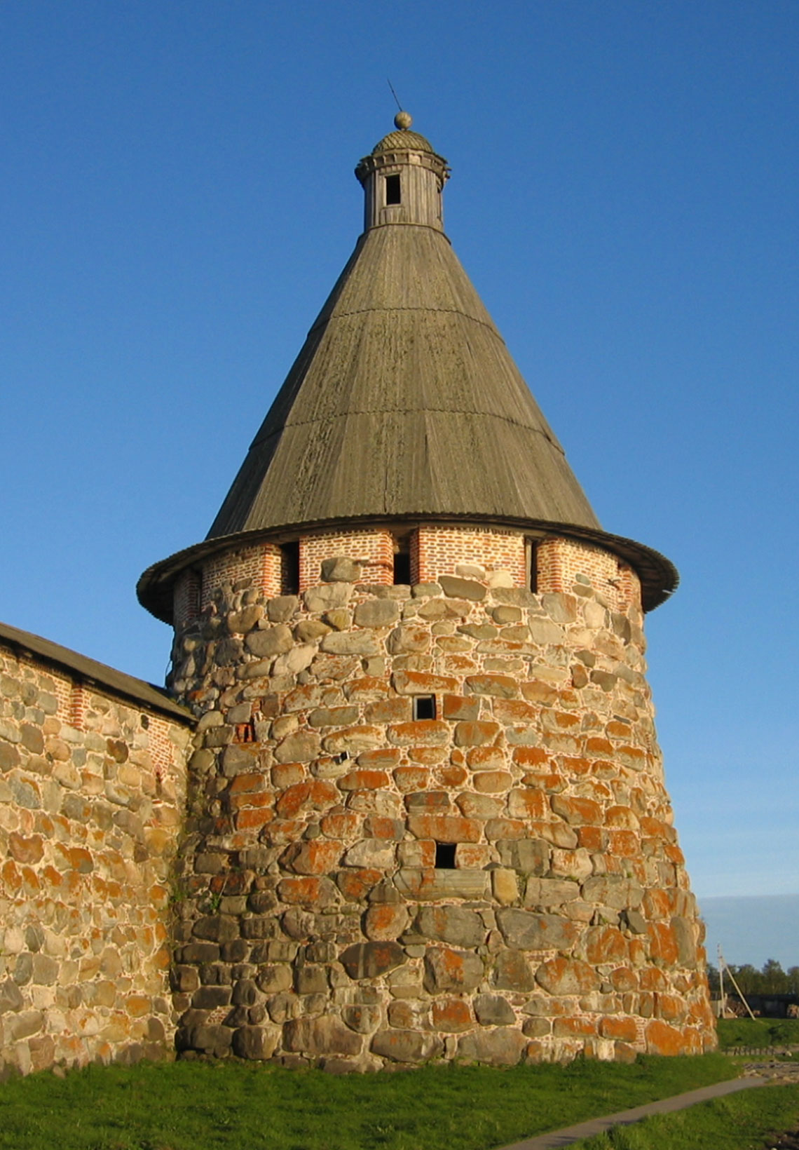 По размерам своим круглые башни почти одинаковы: диаметр Корожной на уровне верхнего яруса составляет 13,65 метра, а Никольской—14,15. Что касается их высоты, то необходимо учесть, что первоначально башни не имели шатрового покрытия: они завершались на уровне зубцов и, конечно, имели тогда значительно более грозный и суровый вид (вспомним, что и башни Московского Кремля до середины XVII века не имели шатров). Считая высотой башен их основную высоту до шатра, мы получаем: для Прядильной — 13,54, для Белой — 14,93 метра и т. п. Внутри все башни были разделены по горизонтали на четыре яруса: первый — на уровне земли, а следующие — на уровне оснований ниш; верхний ярус, окруженный зубцами, профили которых были выложены из кирпича, был открытым. Площадки второго — четвертого ярусов были деревянными, положенными на мощные балки из цельных древесных стволов, упиравшиеся в пазы, проделанные в кладке стен (такие балки можно и сейчас видеть в Прядильной башне). Высота первого яруса Прядильной башни составляла 4,14 метра, второго — 3,5, третьего — 3,3, четвертого (от площадки до верха зубцов) — 2,6 метра. Высота ярусов Головленковой башни — соответственно 3,5; 3,5; 4,9 и 3 метра."