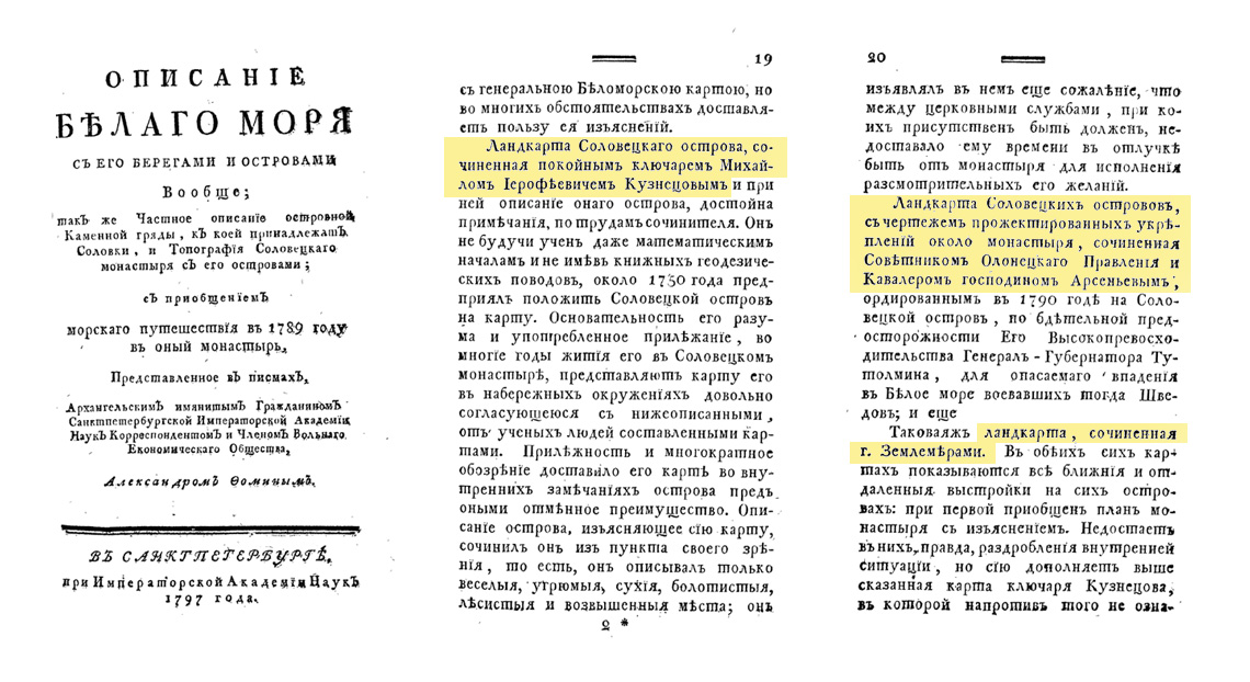 Такая же географическая карта, сочиненная господами Землемерами. В обеих этих картах показываются все ближние и отдельные постройки на сих островах: при первой приобщён план монастыря с изъяснением. Недостает в них, правда, раздробления внутренней ситуации, но сею дополняет выше указанная карта ключаря Кузнецова, в которой напротив того не означено окольных островов; впрочем, все сеи три карты между собой довольна согласуется." ( Александр Фомин. Описание Белого моря с его берегами и островами. Санкт-Петербург. Импер. Академия наук. 1797.)