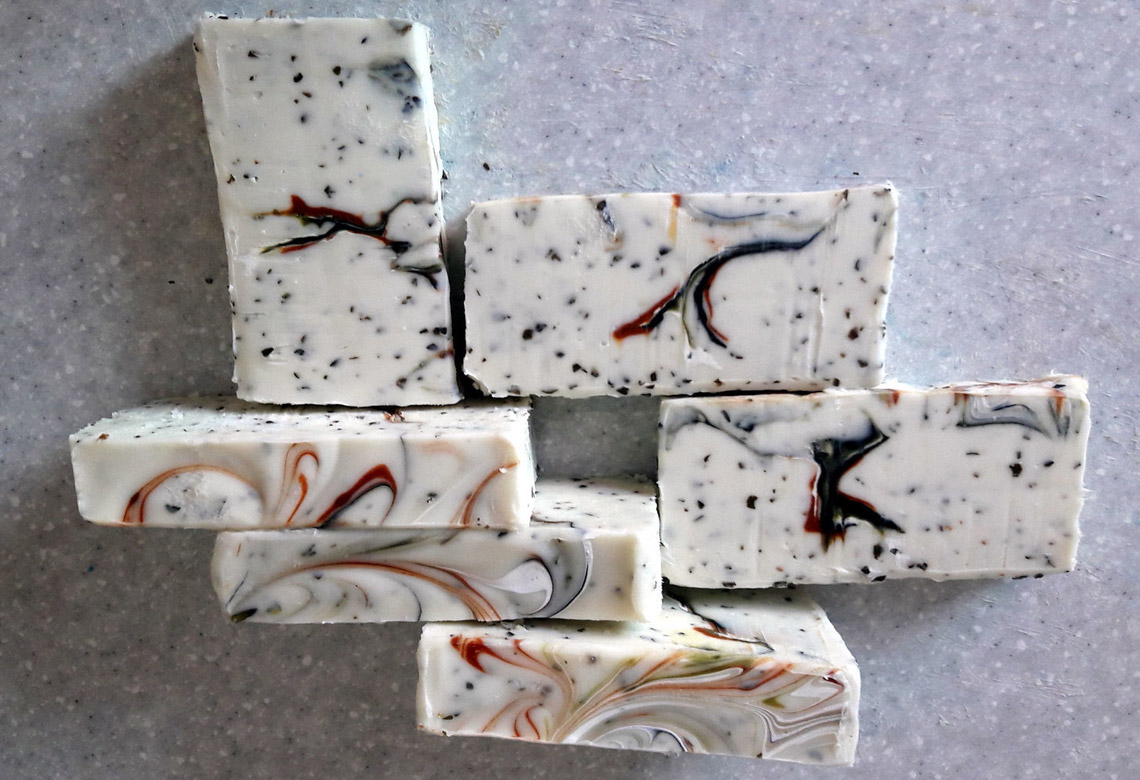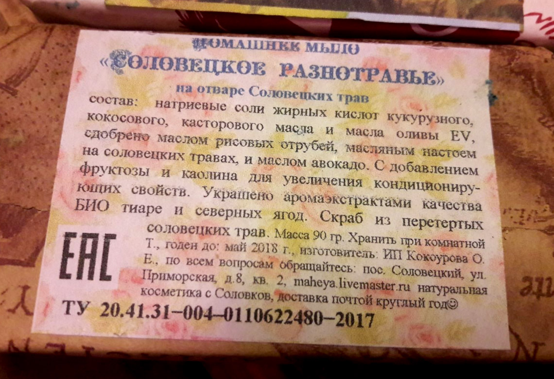 Мыло с нуля "Соловецкое разнотравье" на травах (скраб из соловецких трав) сварено на отваре из трав и сдобрено травяным инфузом. Cсостав: омыленные масла кукурузы, кокоса, касторки, тыквы, виноградной косточки, грецкого ореха. Ароматизировано эфирными маслами мелиссы, аниса, гвоздики и корицы. Использовались следующие травы: брусника, вороника, черника, голубика, морошка, иван-чай, подорожник, вереск, сосна, лиственница, ромашка лекарств, крапива двудомная, тысячелистник, зверобой, черная смородина, малина, герань лесная, таволга вязолистная, клевер, береза, золотарник, манжетка, солерос, мята перечная.