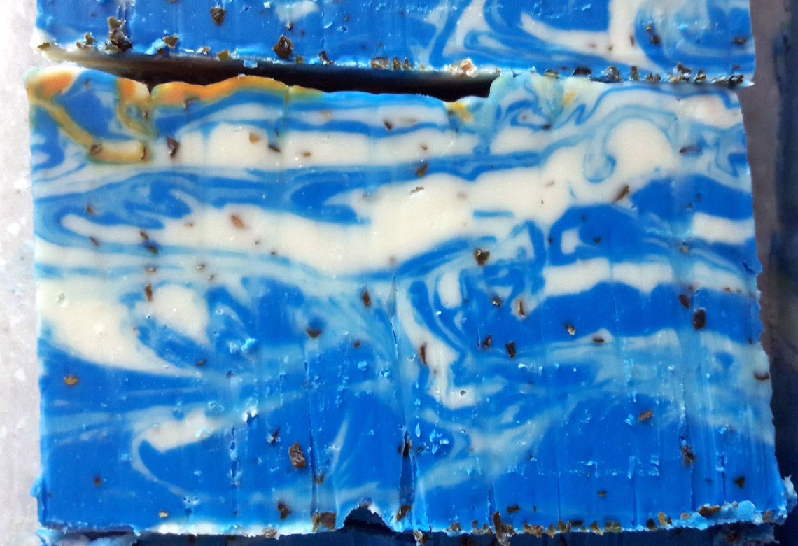 В этом мыле я отрабатывала интересную технику свирл - космический вихрь. Видите, как благодаря своеобразной заливке разноцветной мыльной массы мы в итоге имеем спонтанные, хаотичные и тонкие переливы. Мне это напомнило морскую волну. Мыло содержит ламинарию сахаристую, как нежный скраб. Также для увлажнения добавлена фруктоза и инфуз на водорослях (масляный настой) в качестве дополнительной "полезности". Аромат хвойный, но ненавязчивый. Прекрасно подойдет как подарок мужчинам или женщинам, любящим природные ноты.