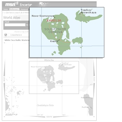 По всей видимости самой широко распространенной ошибкой, касающейся упоминания Соловецкого архипелага следует считать ошибку, допущенную компанией Билла Гейтса Microsoft. На сайте MSN Encarta (www.encarta.msn.com/map_701590262/White_Sea-Baltic_Waterway.html) работает глобальная система MapPoint, принадлежащая компании Microsoft. Эта система предоставляет возможность открыть карту Белого моря с Соловецкими островами. Взглянув на карту, посетитель сразу же сделает три странных "географических открытия":