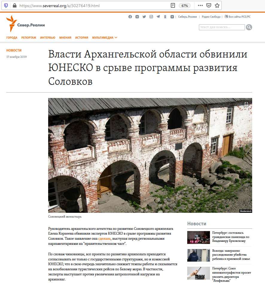 Проекты по развитию архипелага приходится согласовывать с комиссией ЮНЕСКО, что значительно снижает темпы работы и сказывается на возобновлении туристических рейсов по Белому морю - свалила с больной головы, на здоровую чиновница. ( Автор не известен. Власти Архангельской области обвинили ЮНЕСКО в срыве программы развития Соловков. Север.Реалии. www.severreal.org. 17.11.2019).